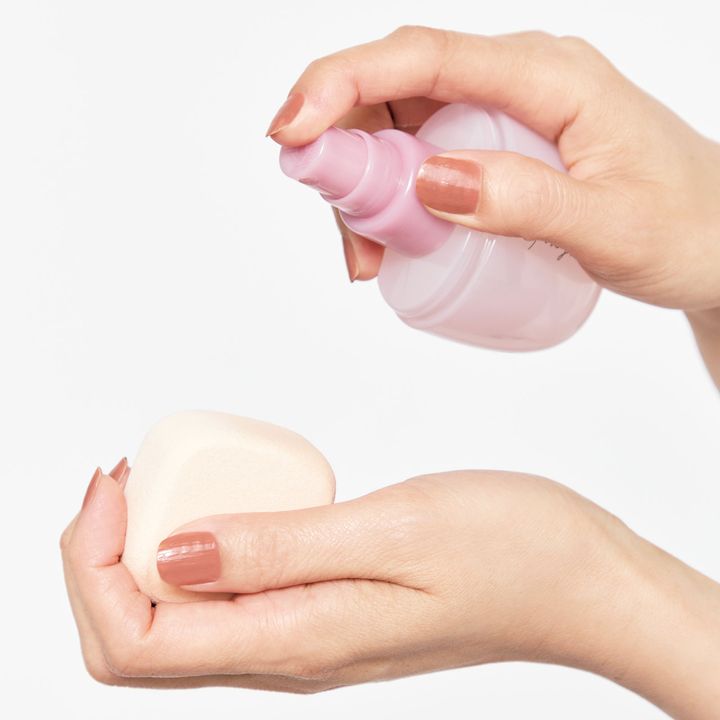 保湿成分配合のみずみずしいフィックスミストを、2プッシュほど、スポンジに吹きかけて湿らせます。