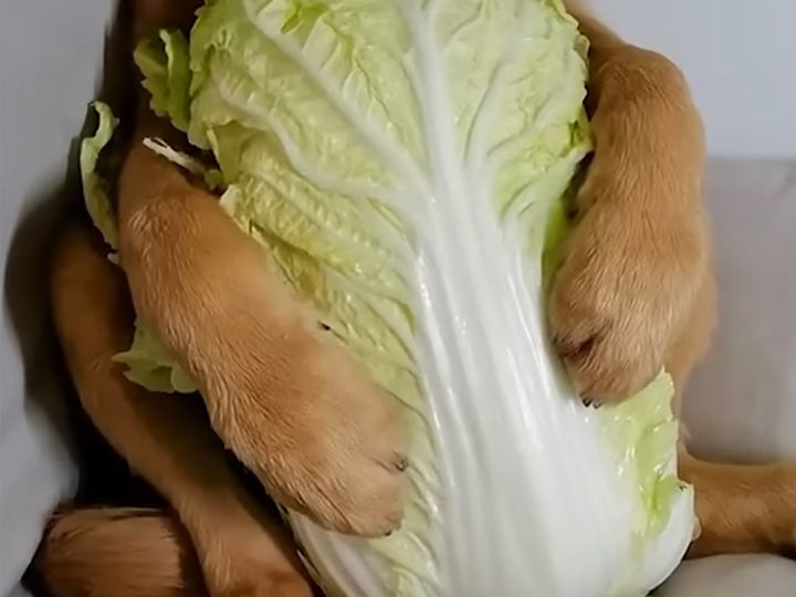 白菜を大事そうに抱えている犬さん、夢中な表情とシャキシャキ音がたまらない!
