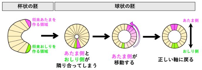 さらに遺伝子発現を追跡すると、球体化の過程で前後軸が一時的に崩壊し、本来は離れている前端(頭側)と後端(尾側)が隣接することが確認されました。
