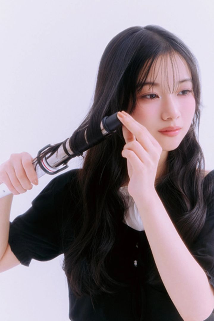 髪全体を32㎜のヘアアイロンでMIX巻きに。ヘアのトップのほうから巻くことで、イヤーマフに負けないボリュームをつくる。