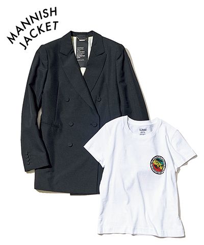「遊びゴコロのあるラフなロゴTとジャケット。ジャケットはダブルで肩パッドがしっかり入った、よりメンズライクなデザインが気分。Tシャツの上にさっと羽織れば、軽い打ち合わせにも対応できるかっちり感を得られます」(スタイリスト・樋口かほりさん) 黒ジャケット/カオス(カオス表参道) ロゴTシャツ/ホリデイ(ホリデイ/フラッグシップサロン オフィス)