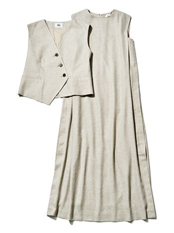 硬派な印象を残しつつ、女性らしさも程よく取り入れる。セットアップの新しい可能性。ベージュリネンベスト、ベージュリネンワンピース/ともにHER. 「ポイントはレディとハンサムの間。ジャケパンの延長で気分転換できる、Iラインワンピ+ベストのスマートなセット」(樋口さん)