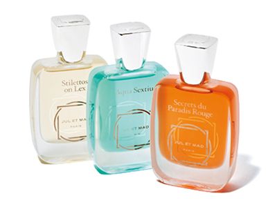 ジュル エ マッド 〈右から〉セクレ デュ パラディ ルージュ、アクア セクスティウス、スティレット オン レックス 各50mL各33,000円/以上ノーズショップ 創設者の実際の恋愛模様が香りのインスピレーション源。纏う人の気配に寄り添って、香りの「物語」が更新されていく。そんな奥行きこそが、ジュル エ マッドの魅力。