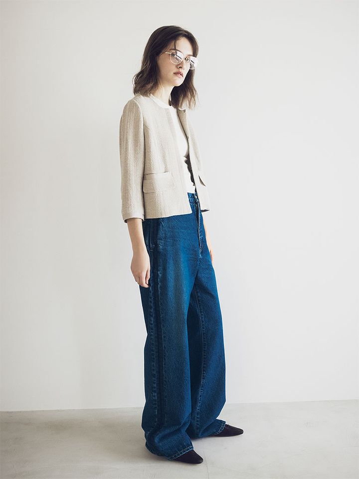 セミフレアシルエットをそのまま太くしたようなワイドデニム。細い脚線を想起させる余白のある筒幅は、端正なシルエットがベースだからおさまりのいい見た目に。ワイドフォルムを引き締めつつ、モードなアクセントも担う濃色のサイドライン。地厚な生地は穿き込むほどにやわらかく。