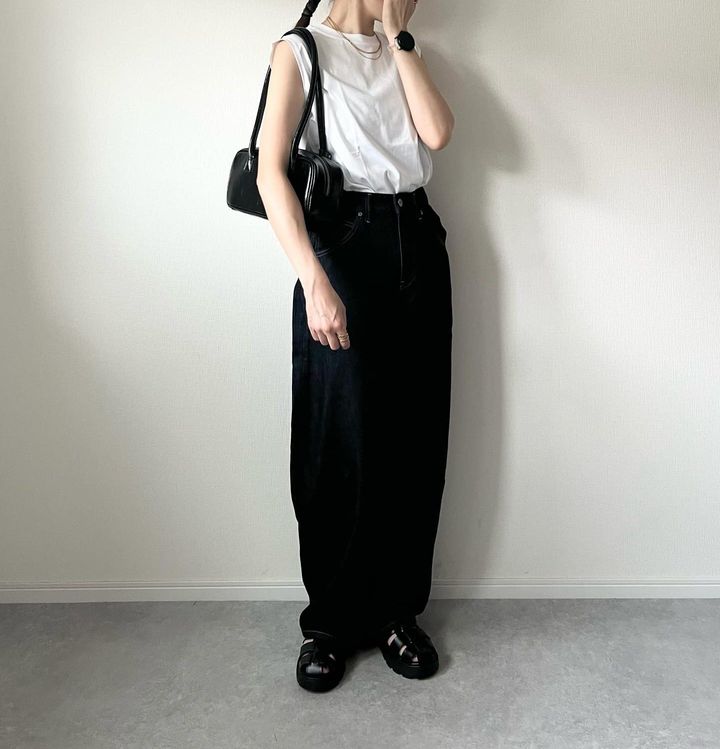 脚のラインを拾わず、すっきりと落ち感のあるシルエットが魅力のユニクロ「バギーカーブジーンズ」4,990円(164cmでサイズM着用)。ほどよい厚みとハリ感のある生地は、体のラインを拾いにくく安心してはけるのが大人世代にうれしいポイントです。シンプルなユニクロの「エアリズムコットンT/ノースリーブ」1500円(164cmでサイズM着用)を合わせるだけで、即きれいめスタイルが完成します。