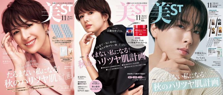 お待たせいたしました!9月17日(水)発売・美ST11月号の表紙解禁です!本誌・増刊は吉瀬美智子さん、特別版Special Editionは宮舘涼太さんが初表紙を飾ります。本誌付録はエテルナムの3STEPケア10セットとSUQQU初のスキンケアファンデ、増刊付録はグレイス ワンのハリ形成ナイトクリーム。特別版Special Edition付録にはエテルナム5セット・VTの美容針ブースター、さらにルミアグラスのアイライナーが現品付録でつきます!豪華付録につき完売必至です。ネット書店が完売の際は、お近くの書店でのご予約がおすすめです。