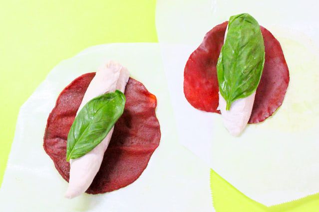 こちらは茹でささみとバジルの葉を包んだおつまみ。こちらの方が包みやすく、「トマトペーストペーパー」の丸い形も目を引きます。