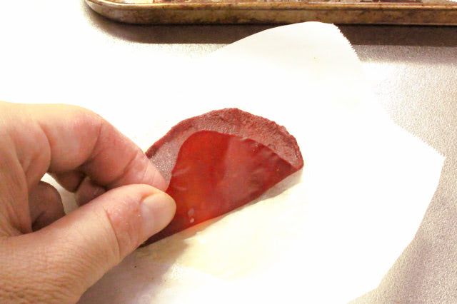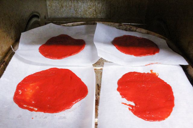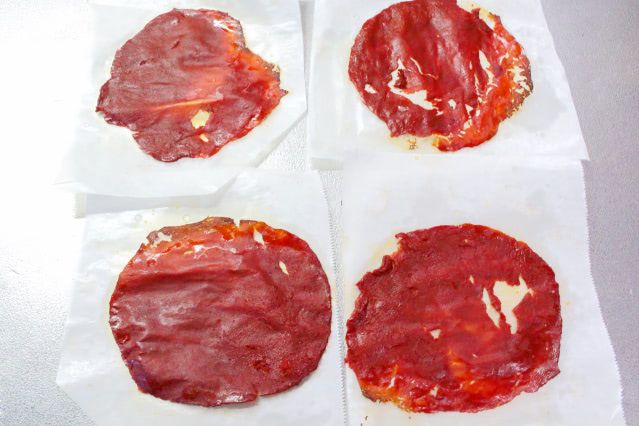 今回目に留まった「赤い皮」の材料は、なんと、トマトペーストだけ!小さく切ったクッキングシートに少量のトマトペーストを挟み、オーブントースターで焼くんですって。
