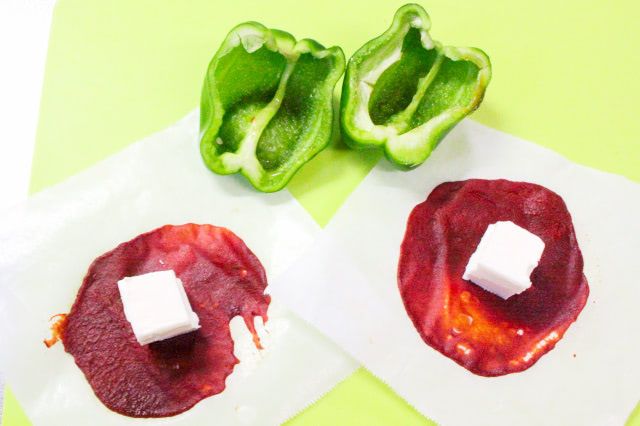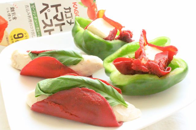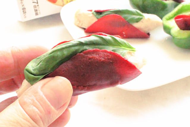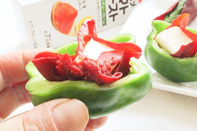 クリームチーズと「トマトペーストペーパー」のねっとり感が似ていて、とてもやわらかい食感。パリッ!とした生のピーマンの食感と対照的で、おいしくいただけます♪