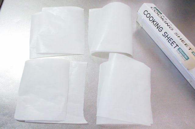 1. クッキングシートを10cm四方に8枚切ります。