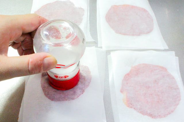 クッキングシートを被せて、上から円形に広げます。やわらかいトマトペースを薄くする際、フタが平らな、うま味調味料のビンが役立ちました♪