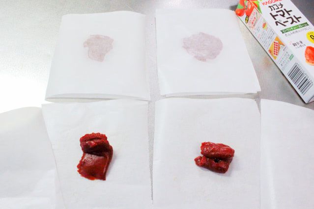 クッキングシートを剥がせば、「トマトペーストペーパー」が完成!のはずが…。上のクッキングシートをはがすと、トマトペーストの一部が張り付いてしまい、破れたような状態に。
