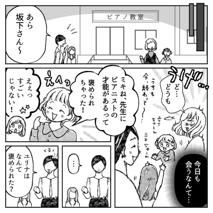 あまり関わりたくはないものの、ピアノ教室でばったり橘さんと会ってしまったエリカ。しかし、どうやら橘さんの娘・ユリナちゃんは元気がない様子だ。