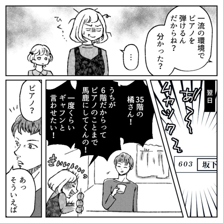 エリカに同じタワマンに住む橘さんは、高層階住まいが自慢のようで、6階に住むエリカに対して何かとマウントを取ってくる。いつも階数を話題にしてきたり、娘たちが通うピアノ教室のことでも嫌味を言ってきたりと、エリカを敵対視してくることが多かった。そんなある日、ピアノの発表会が開かれることになる。しかし、この発表会でとんでもないトラブルが起きることに!?