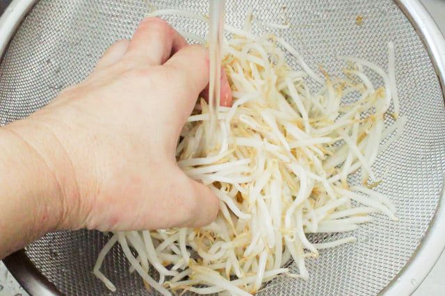 電子レンジ(600W)で2分30秒加熱すると、もやしが熱々に。流水で冷まして、しっかりと水気を切りました。