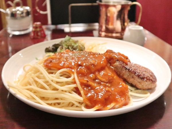 ハンバーグはふっくらと柔らかくお肉のうま味がぎゅっと閉じ込められています。もっちりとしたパスタには甘いソースが絶妙に絡み、喫茶らしい味わいにほっとします。
