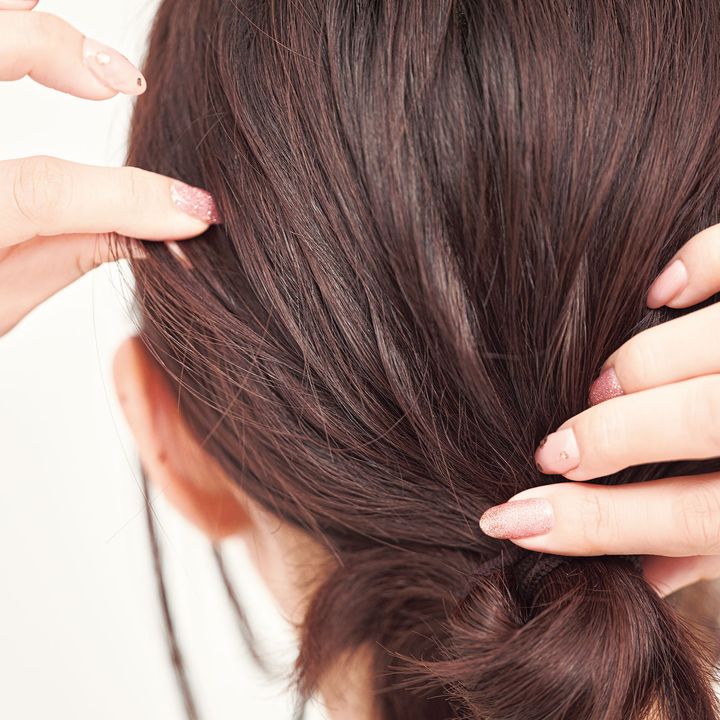 お団子にした髪の後頭部の毛を引き出す