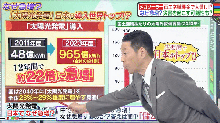 こうした目的もあり、同事業のスタート地点ともなった2011年においては、48億kWhだった太陽光発電量が、12年後の2023年度には965億kWhと約22倍に急増し、電力全体の約1割を賄っている。国は、これを2040年には全体の23%~29%程度に増やす見通しだ。