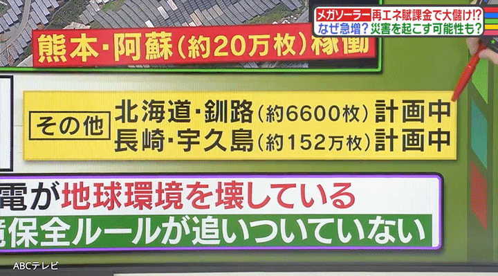 他にも、長崎の宇久島では、約152万枚ものメガソーラーが計画中。すでに阿蘇では、約20万枚のメガソーラーが稼働しているという。