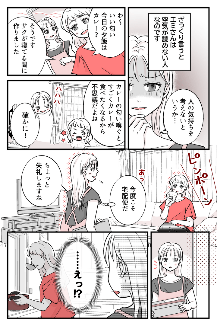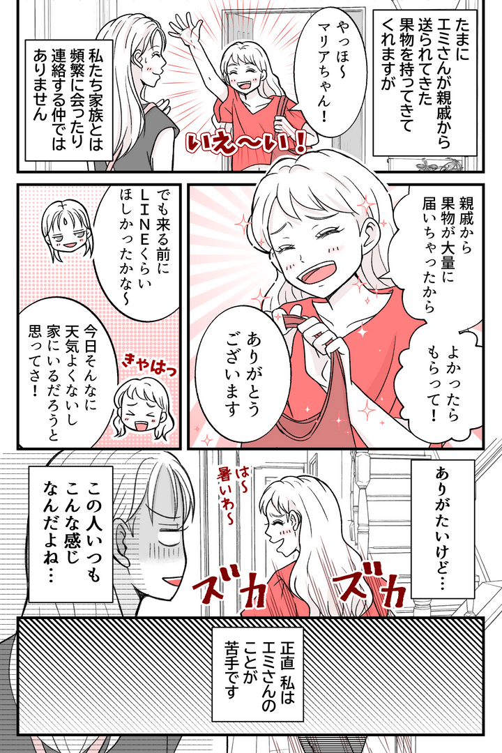 新鮮な果物をいただけるのはとてもありがたいのですが、正直、私はエミさんのことが苦手です。ざっくり言うと、エミさんは空気が読めない人。人の気持ちを考えずにお金の話や夫婦間の問題などをどこでも話してしまうのです。