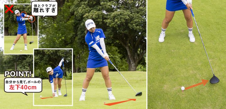 両手とグリップエンドが体から離れる人は、ボールの左下40センチぐらい先(いわゆるインサイド)をヘッドが通過する様に振りましょう