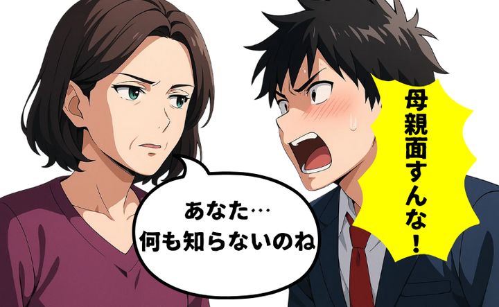 「私はたしかに実の母親じゃない。でも、あなたが生まれたときから育ててきたの。成人したら伝えるつもりだったけど、こうなったらちゃんと話すわ。あなたは、お父さんと昔の浮気相手との子よ」