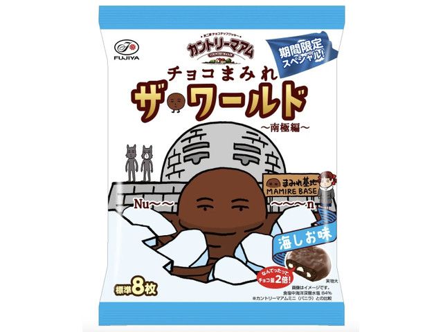 ・しっとりチョコクッキーに海洋深層水塩とホワイトチョコチップを組み合わせ、チョコレートでコーティング ・ほんのり塩味がクセになる「海しお味」の期間限定商品 ・南極を旅するまみれさんをイメージした、涼しさ満載で冒険感溢れる全7種の個包装デザイン