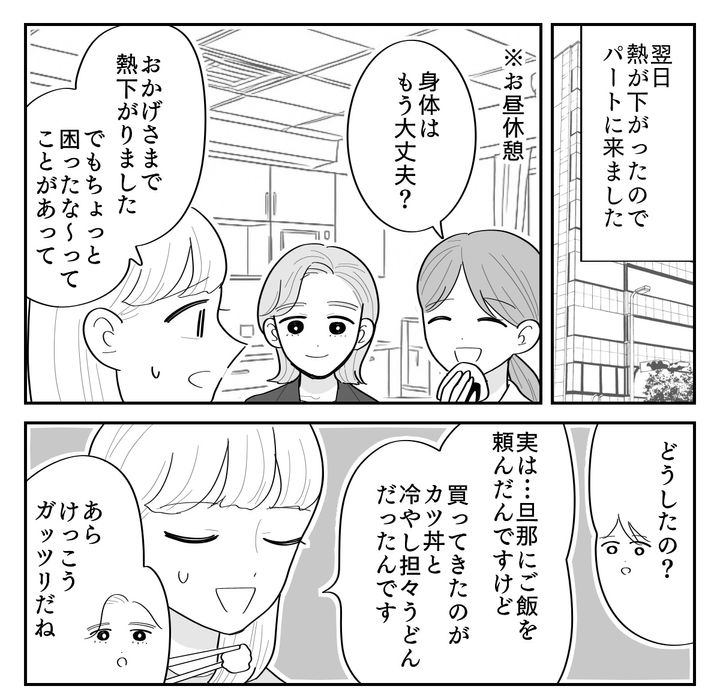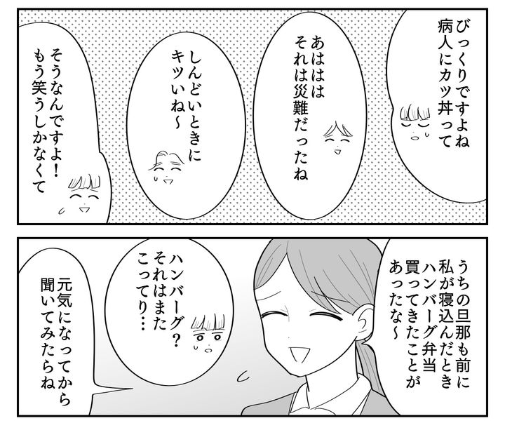 仕事先でのお昼休憩で、私は思わずグチります。「ビックリですよね。病人にカツ丼って」すると似たような話を打ち明けられました。パート仲間のひとりはなぜハンバーグ弁当を買ってきたのか、旦那さんに聞いてみたそうですが……。