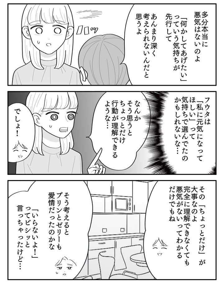 翌日、私はお昼休みにフウタの行動について話しました。すると意外なことに、他のパートさんたちからは「あるある!」と共感の声が……! 熱を出したときにハンバーグ弁当を買ってこられた話や、甘いものをまったく食べないのにプリンとゼリーを買ってこられた話が飛び出しました。自分だけじゃないと分かって、みんなで大笑い。心が少しだけ軽くなりました。