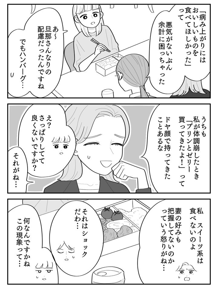 妻が病気になったとき、よかれと思って予想外のものを買ってくる旦那。とても食べられないガッツリ系のお弁当だったり、好みに合わないスイーツだったり……。気遣いが完全に空回りしています。「何なんですかね、この現象って……」