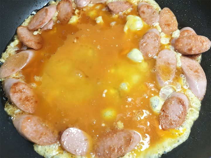 4. 2を加えて一度火を止め、卵が余熱で半熟になったら別皿に取り、休ませておきます。