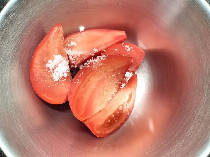 1. ボウルにトマト、砂糖小さじ1/4、塩小さじ1/4を入れて軽く馴染ませます。