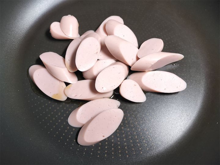 3. 強火で熱したフライパンにゴマ油小さじ1/2を加えて魚肉ソーセージを焼き、こんがりときつね色の焼き色がついたら、ゴマ油大さじ1を加えます。