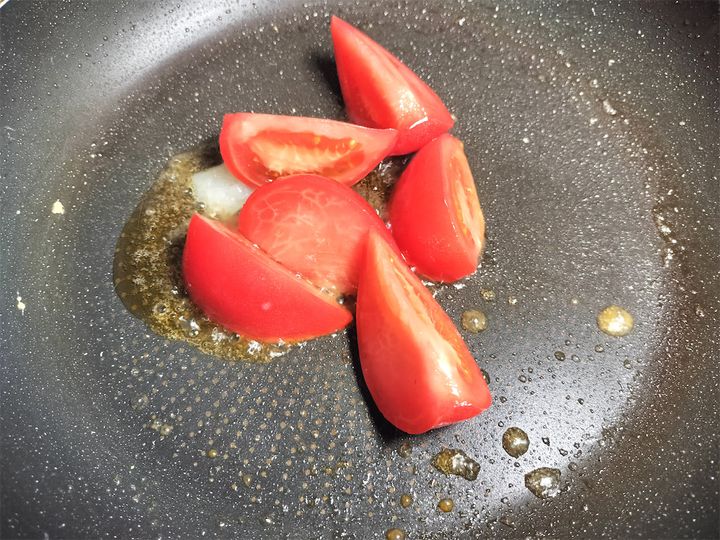 6. トマトがとろっとしてきたら、水大さじ1を加えて、フライパンについたトマトの旨味をトマトに戻して煮詰めます。