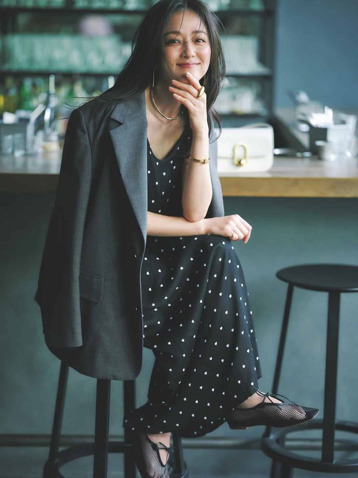 夏に一枚で着ていたキャミ風ドットワンピースも、グレーのジャケットを肩掛けするだけでシックな秋顔へ。ドットの甘さを大人っぽいテーラードが引き締めて知的なムードに。足元は透け感のあるメッシュシューズで軽やかさをプラスして。