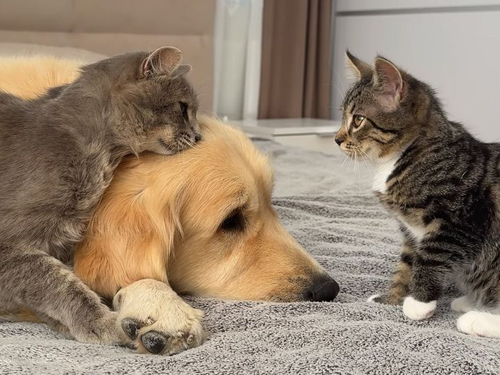 犬さんを巡る猫たちの三角関係、微笑ましい親友争いが可愛い