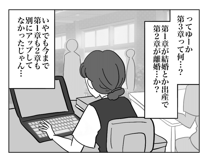 ユキノさんは今年度、小学校のPTA役員でミサさんと一緒になりました。ミサさんはお互いの子どもが保育園に通っている頃からのママ友。ミサさんはSNSに日常のなにげない出来事を投稿しており、ユキノさんも毎回「いいね」を押していました。するとある日、ミサさんのSNSに離婚報告が……! 「第3章の人生の幕開け」という謎フレーズもあり、ユキノさんは困惑してしまいました。
