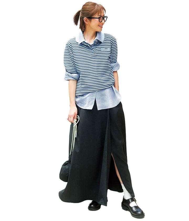 3. 太フレームのメガネの日にこそ!地味にならない華やかな〈ロングスカート〉で