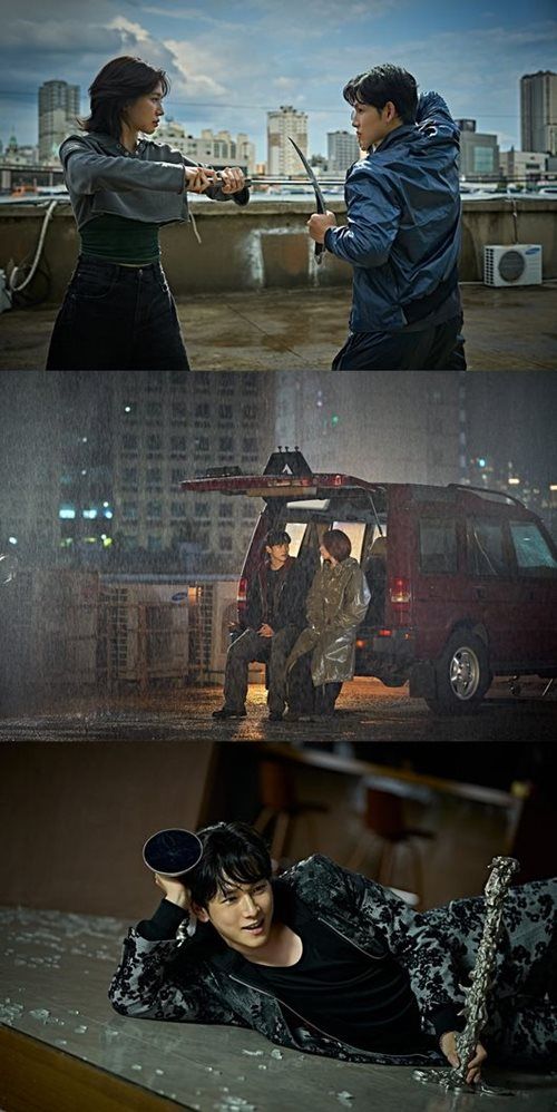写真には、無法地帯と化した殺し屋の世界で頂点を目指してぶつかり合うハヌル(演者イム・シワン)、ジェイ(演者パク・ギュヨン)、トッコ(演者チョ・ウジン)の緊張感あふれる姿が収められている。