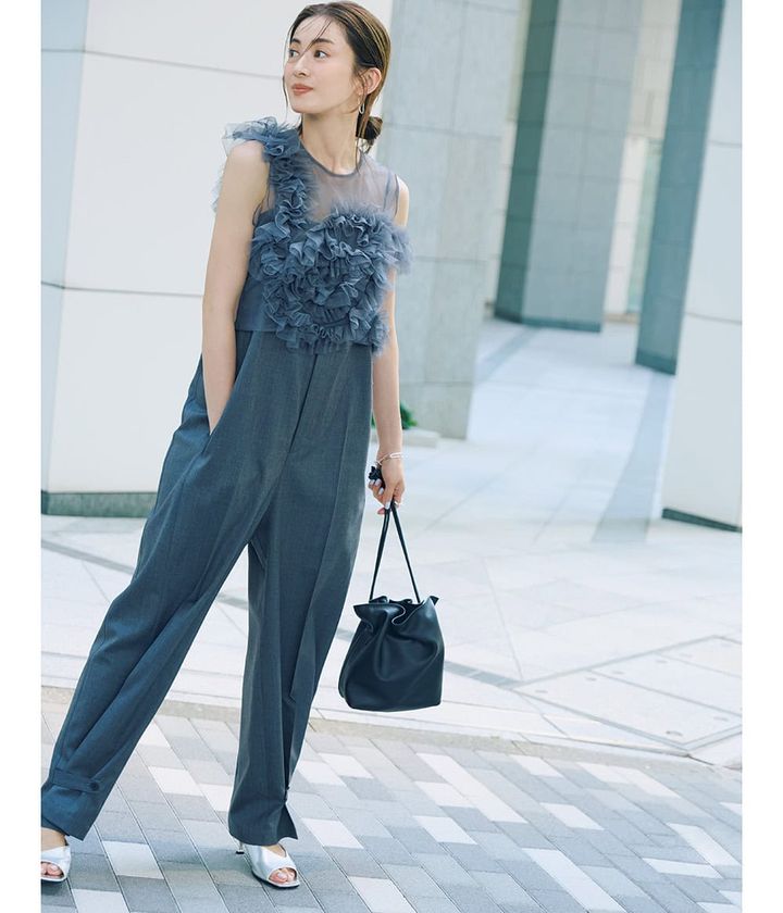 存在感あるチュールトップスもグレーなら重くならずマニッシュに。パンツではなくオールインワンに合わせることでシルエットもすっきり。凜とした佇まいも楽に叶う。シックなカラーの時はツヤ感のあるまとめ髪でしなやかさを加えて。