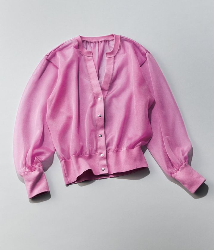 引き続きトレンドのシアーカーデは、ピンクなのに甘くないのがいい。ピンクの濃淡で合わせてハッピーに着るのも、黒に合わせるのも◎。