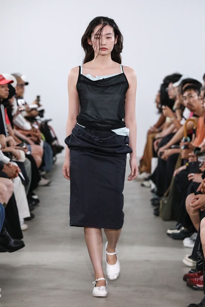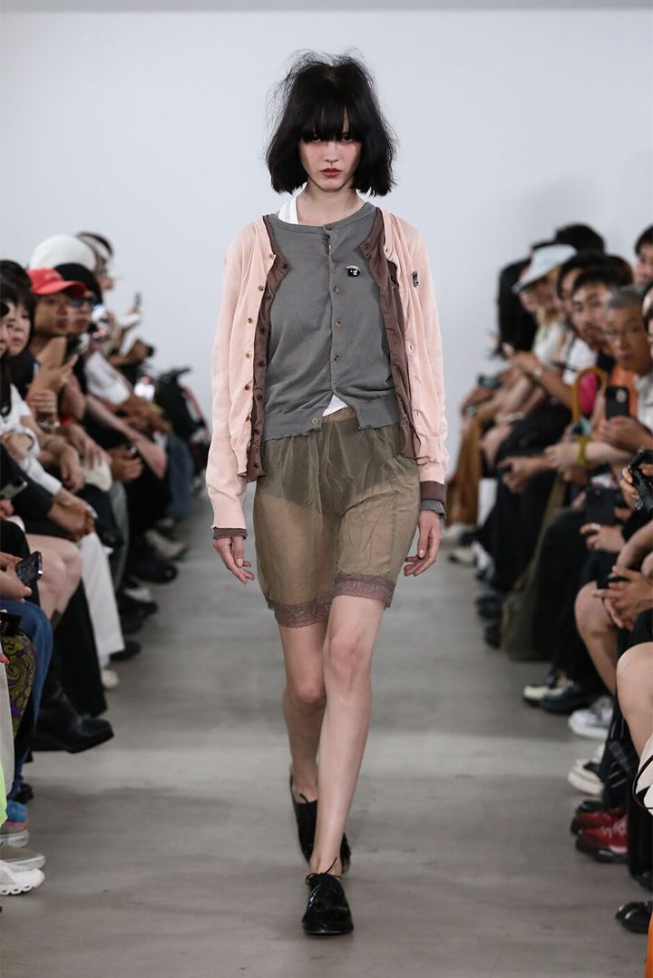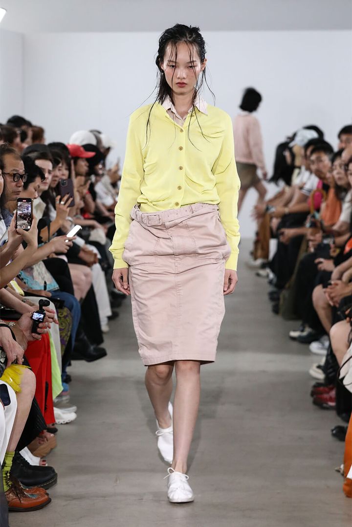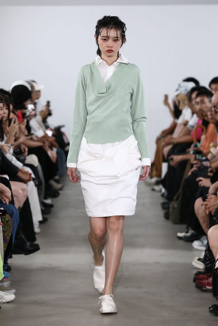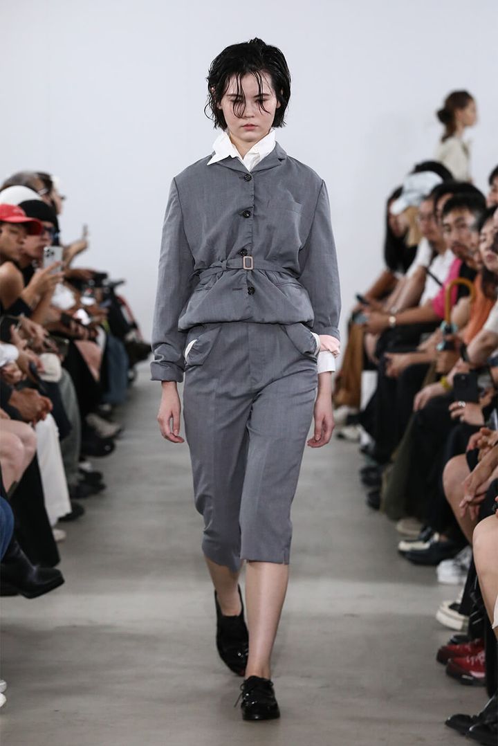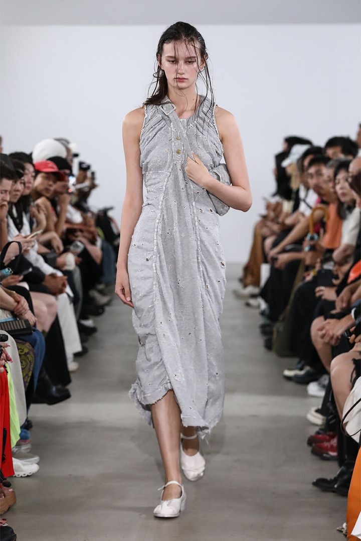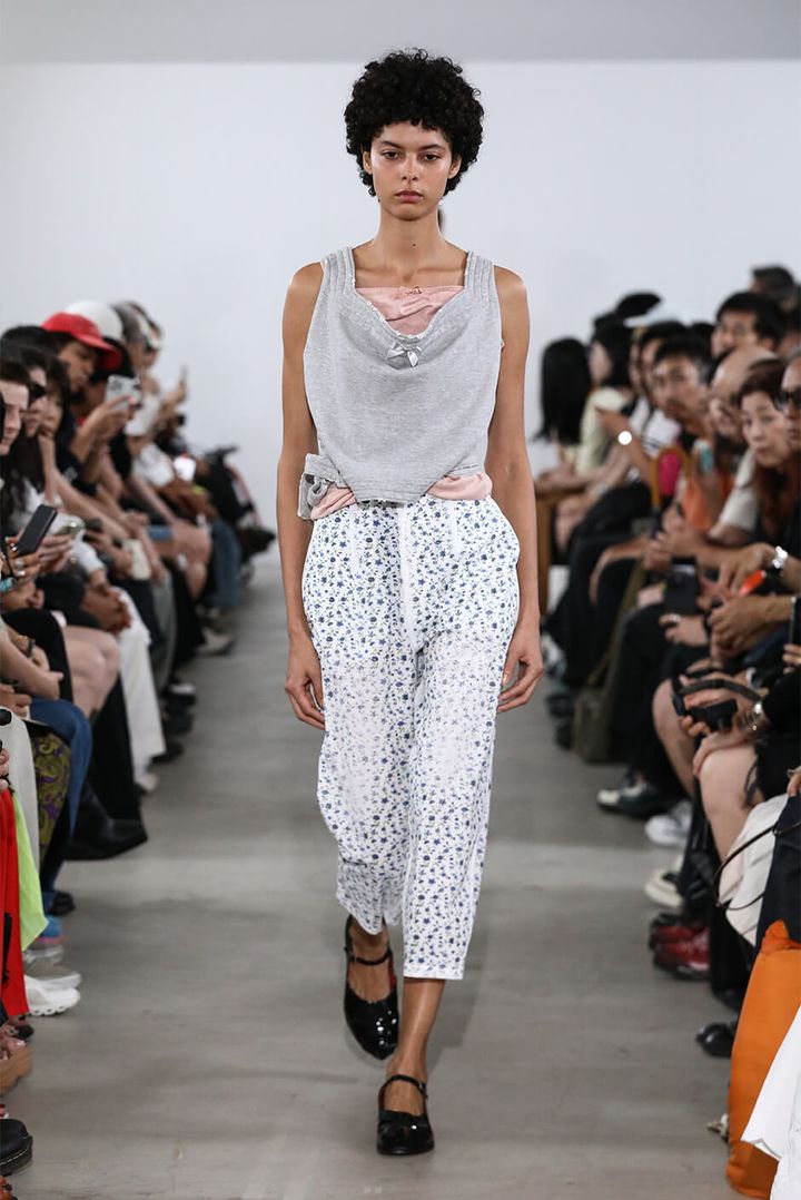 デザイナー 村上は「スーパーマーケットの2階に並ぶ婦人服を思い描きました。ショーでは、休日の昼過ぎに起きて、どうしても水を買いに行かなくてはならない時に着るような、部屋着や日常着の延長にあるムードを演出しました」と語る。