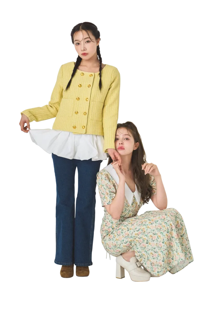 〈右・ナナ〉小花柄ワンピース 19,910円/LILY BROWN リング 36,300円/アビステ ローファーパンプス 25,850円/ダイアナ(ダイアナ銀座本店)〈左・紗英〉ノーカラージャケット 6,980円/ROSE AURA フレアーデニムパンツ 14,300円/JILL by JILL STUART ペプラムベルト 8,800円/yae(アンティローザ)ショートブーツ 19,900円/チャールズ&キース(チャールズ&キース ジャパン)