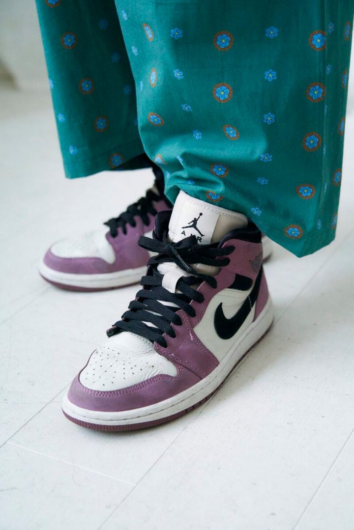「私は昔バスケットボールをやっていて、NBAロサンゼルス・レイカーズのキングこと、レブロン・ジェームズの大ファン。バスケットシューズは推しにちなんでキュートなベリーピンクを選びました」(土村さん)。グリーンカラーコーデに、足元をパープル系で引き締めました。