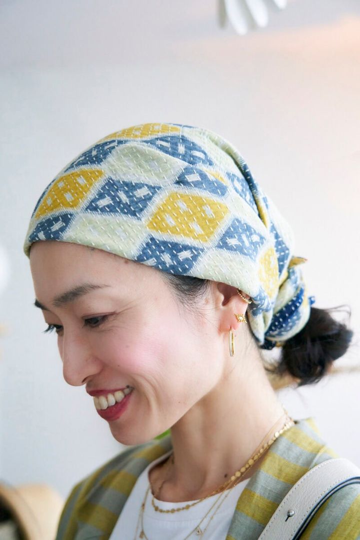 インドのヴィンテージサリーをほどいてカンタ刺しゅうをしたハンドメイドスカーフ。「私のモノづくりの師匠が作ったものです。髪をまとめたときのヘッドスカーフに愛用しています」(土村さん)