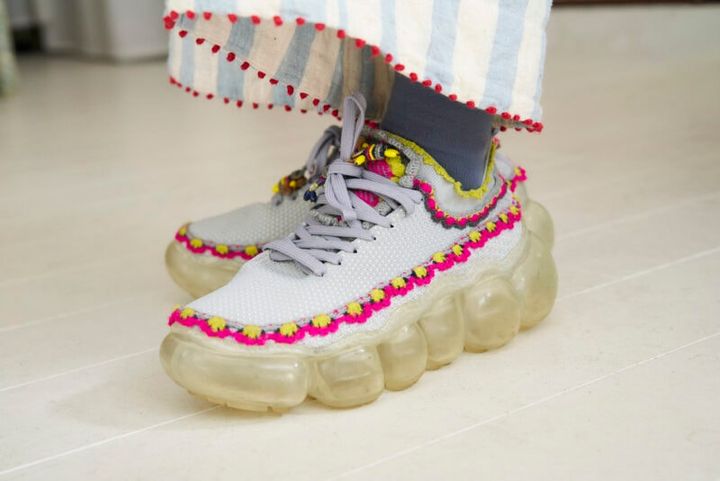 「インドの靴や洋服は、手の込んだ刺しゅうが施してあるのが魅力。ワイドパンツのすそに付いた赤い玉の刺しゅうと、スニーカーにぐるりと縫いつけたコード刺しゅうが可愛くて。お気に入りのピンクコーデの仕上げに、このスニーカーを合わせました」(土村さん)