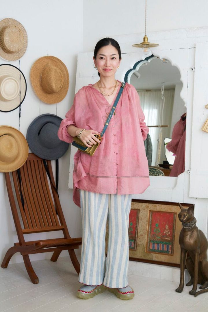 土村さんのお気に入りのデザイナーは、インドのトップデザイナーのひとりペロ。「『インドのコムデギャルソン』と呼んでいます。このピンクのシルクコットンシャツは、花柄のインナーがセットになっていて、すその辺りにはノット刺しゅうのドットが連なっています。涼しいのにきちんと見えて、細かなところに可愛いがつまっているところが、気に入っています。大人になってから、ピンクが好きになり、気持ちをアゲたい日はピンクを選びますね。淡いブルーのストライプパンツを合わせた今日のコーデは、懐かしいキャラクター『キキ&ララ』のイメージ」(土村さん)。コード刺しゅうが印象的なスニーカーとマルニのバッグを合わせて、きれいめにまとめました。