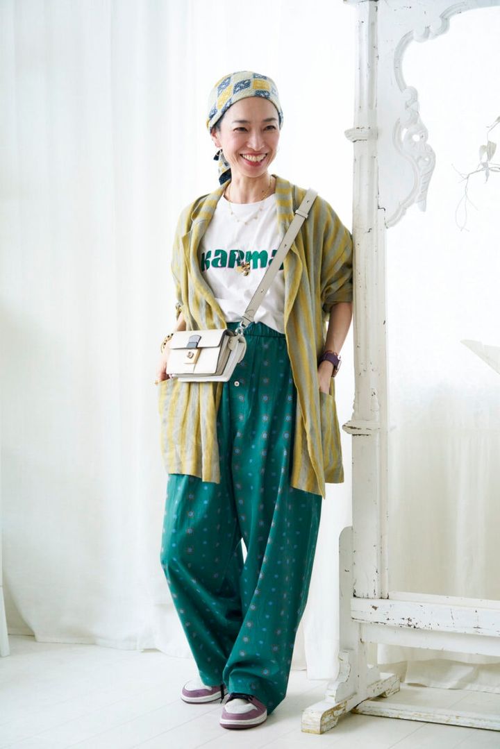 ジュエリーの買いつけのためにインドへの出張が多い土村さん。KARMA(カルマ)のロゴが可愛いTシャツは、インドのジャイプールのマハラジャファミリーが営むメーカーPDKFのもの。「日本人が"カルマ″と聞くと、スピリチュアルな特別なイメージと思われがちですが、インドではもっと日常的なものです。このロゴTをメインに、長時間のフライトでも窮屈にならないパジャマパンツを合わせて、リネンジャケットをはおりました」(土村さん)。濃淡をつけたグリーンのカラーコーデが爽やかです。