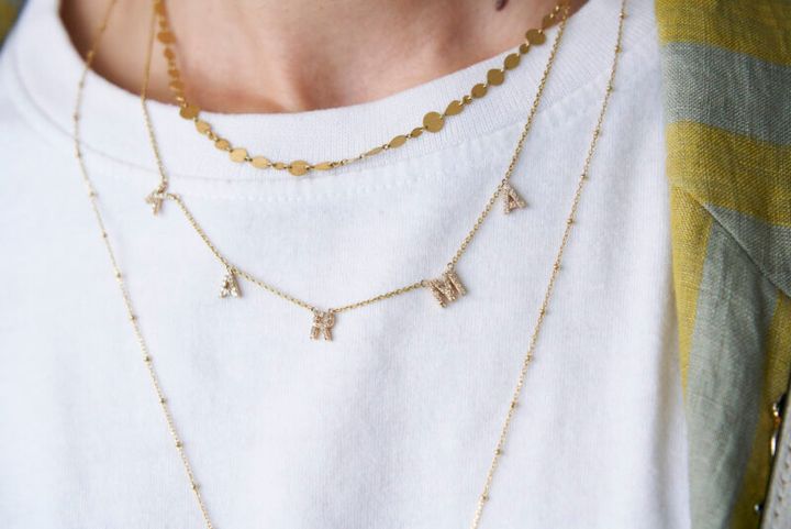 「日本ではネガティブなイメージを持たれやすい『カルマ』ですが、インドでは『未来のための課題』や『役割を果たす』とポジティブに解釈します。それを知ったときに、文字をチャームにしたら❝自分への理解が深まり、素敵でポジティブになる❞と直感し、ダイヤモンドを連ねてデザインしてジャイプールで作りました」(土村さん)。そんなウイットに富んだジュエリーは、ゴールドの長短のネックレスと重ねづけして華やかに。