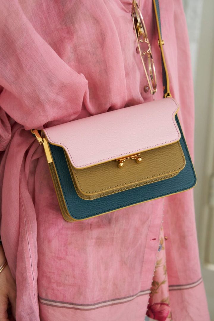 ピンクコーデを引き立てるカラフルなマルニ バッグ